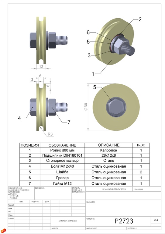 Ролик бельевой капролоновый d 60 без скобы под трос 8мм - для устройства раздвижных ворот.