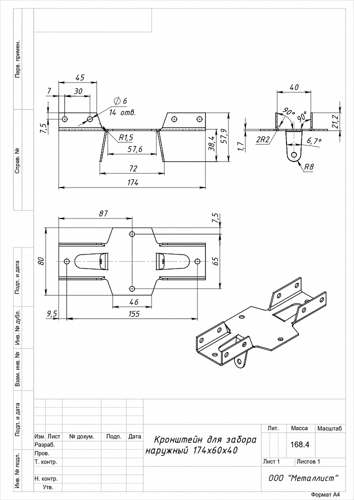 Кронштейн для забора наружный 174*60*40 ГОЦ (28шт) 125117464-012