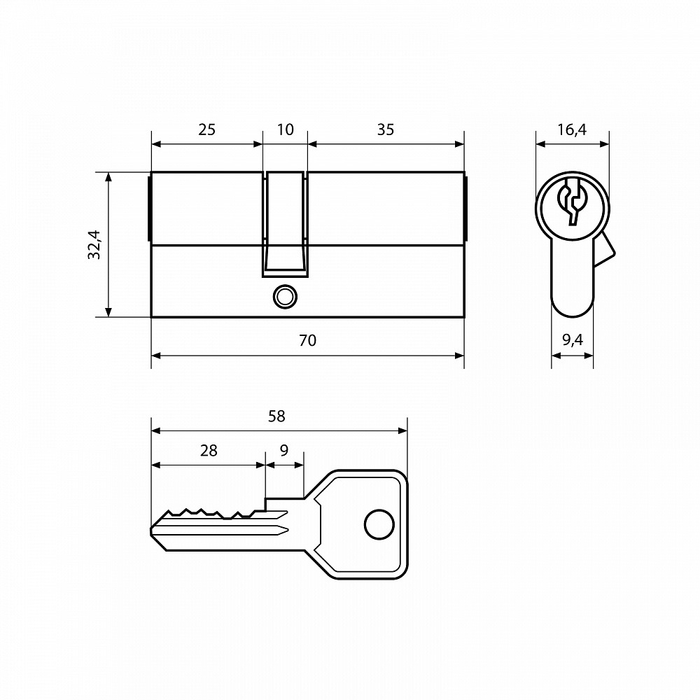 Механизм цилиндровый для врезных замков. Европрофиль. Английский ключ. Материал цилиндра - сталь, цинковый сплав. Ключ-ключ. Выступающий на 30 градусов из плоскости механизма кулачок защищает цилиндр от выбивания из двери. Длина механизма - 70(25x10x35)мм. ПРИ УСТАНОВКЕ НЕ ИСПОЛЬЗОВАТЬ ЭЛЕКТРО ИНСТРУМЕНТ!
