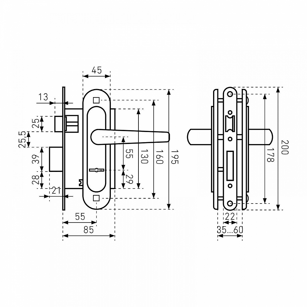 Стальной оцинкованный корпус, засов с вылетом 22мм. Межосевое расстояние 55мм. Удаление ключевого отверстия 55мм. Габаритный размер 130х85 мм.